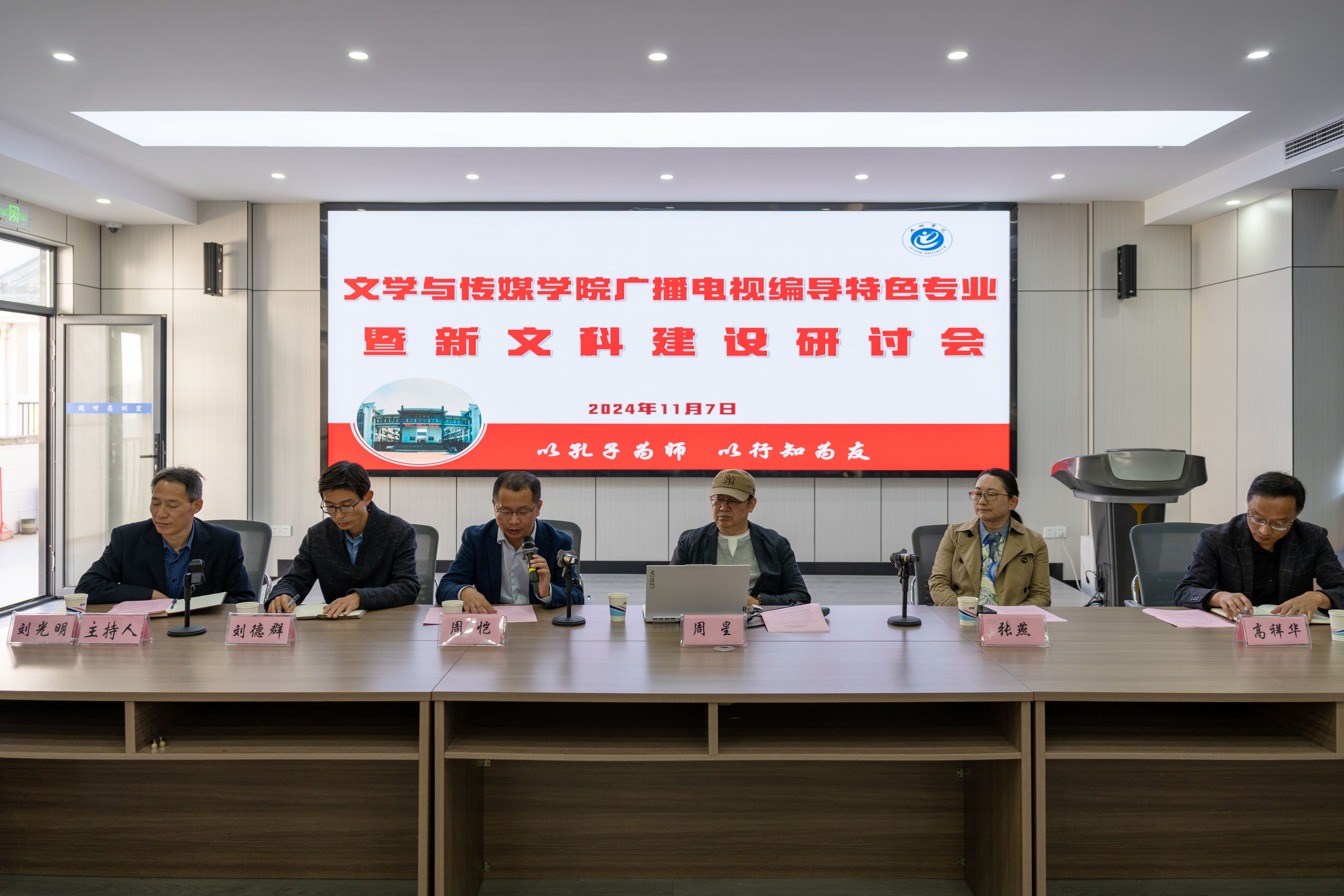2024年11月7日上午,文学与传媒学院在博物楼视听实训室举办广播电视编导特色专业暨新文科建设研讨会。会议邀请了教育部高等学校戏剧与影视学类专业教学指导委员会主任周星教授、秘书长张燕教授作为主讲嘉宾。教务处处长周恺,广播电视编导专业教师参加会议。会议由院长刘光明主持。