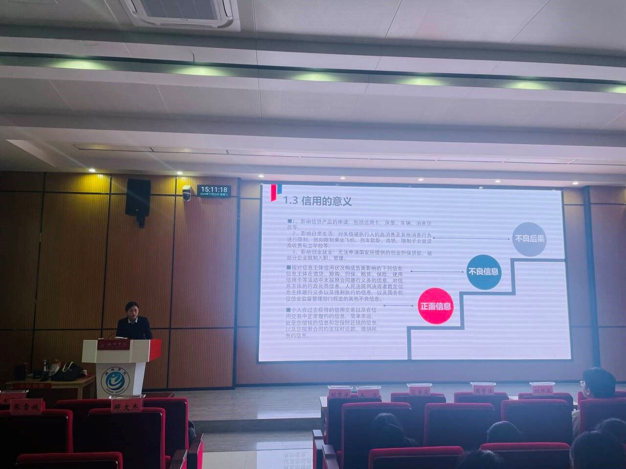 活动中,肖娅以“珍爱信用记录,共筑诚信金融”为主题进行征信宣讲。她结合实际案例,深入浅出地讲解了个人征信的概念、重要意义及作用,内容丰富、详实。她提醒同学们要树立正确的消费观念,远离非法校园贷,珍惜个人信用记录,避免因金融风险而影响学业和未来发展。