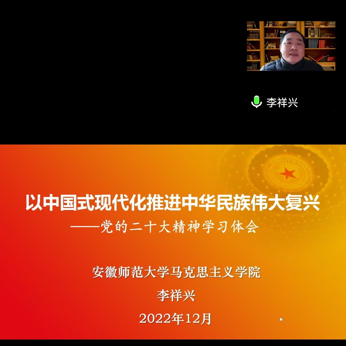 按照省委教育工委统一部署,12月21日,全省高校学习宣传贯彻党的二十大精神专场宣讲报告会在必赢举行。安徽师范大学马克思主义学院副院长、省委讲师团高端宣讲专家、省高校师生巡讲团成员李祥兴教授应邀在线上作专题宣讲报告。校党委书记孙晓峰主持报告会。校党委理论学习中心组成员,部门主要负责同志、二级学院党政主要负责同志集中收看了报告会。