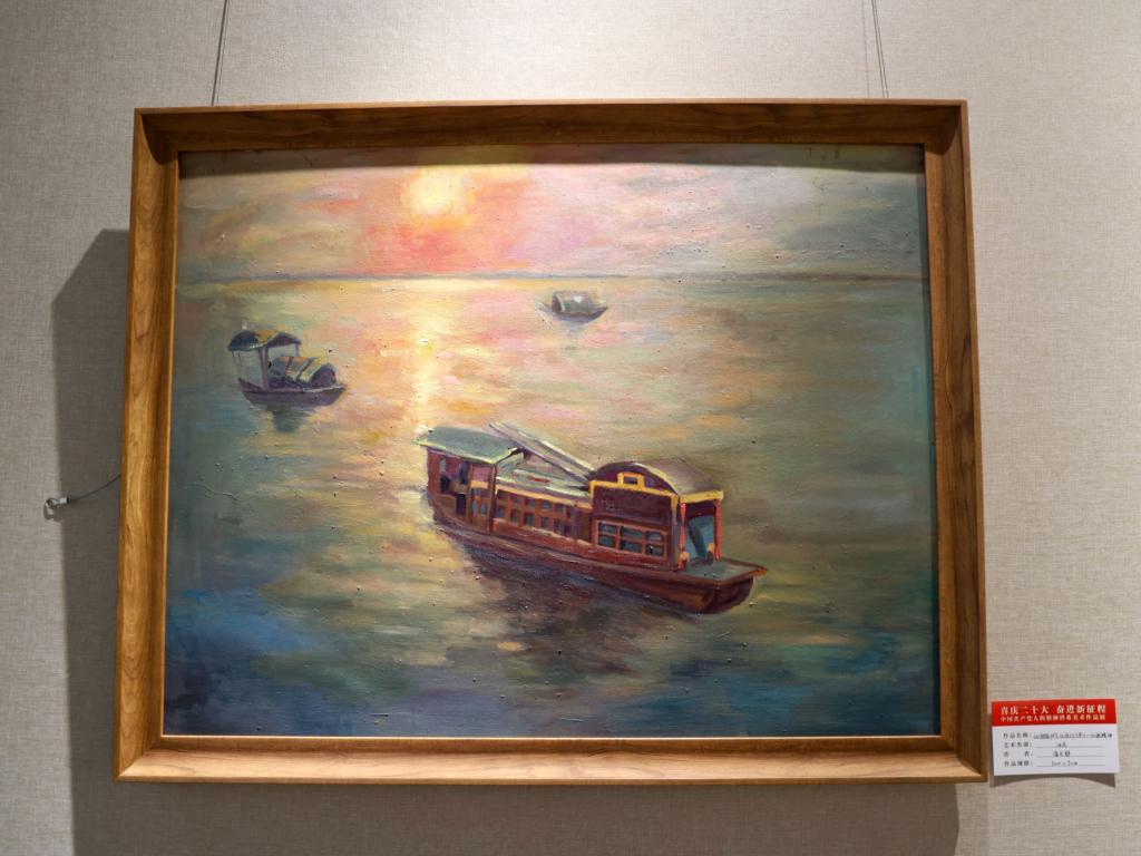 作品《红船载千钧,征程行万里》的创作者2019级美术学潘光静同学表示,红船是中国革命源头的象征,在画面上用日出东方的阳光普照红船来体现党的伟大光辉,并向着美好的未来前进。同时这一艘小小红船承载着民族希望,最终成为中华民族伟大复兴的巍巍巨轮。