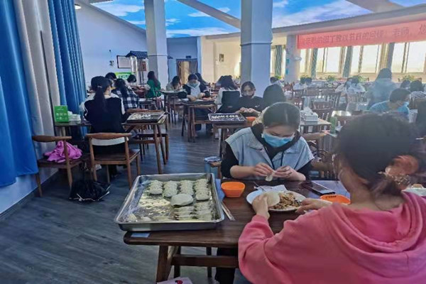 为了实现这顿特殊的“家宴”,八位辅导员切磋策划了好几天。并与学校三食堂取得联系,经理王梅和厨师长陈文军热心帮助他们提前采购好鲜肉、蔬菜、鸡蛋、面粉、调料等。他们在学院特困生中招募了二十多位包饺子小能手,大家按照食品卫生安全要求进行清洗、切菜、调配、搅拌等各种忙碌,制作了白菜香菇肉馅、韭菜鸡蛋两种馅料。为确保防疫安全,师生在食堂有序分区分桌操作,虽然每个人的手法不同、花褶各异,却共同把快乐和祝福包进饺子,营造春日里校园的相亲相爱。