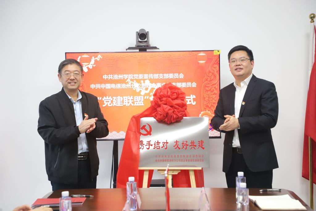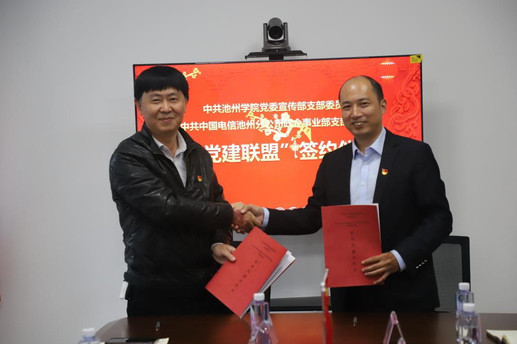 胡兵与中国电信池州分公司政企事业部党支部书记江峰分别发言,双方党支部共同签订了“结对共建”合作书。