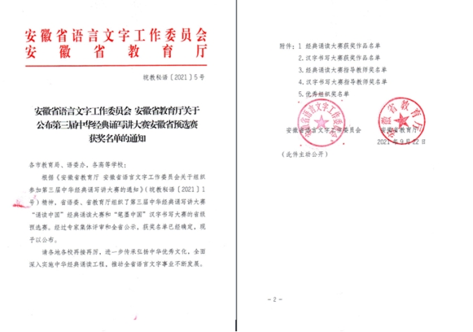 近日,安徽省语言文字工作委员会和安徽省教育厅公布了第三届中华经典诵写讲大赛经典诵读大赛安徽省预选赛的结果,必赢共有6组作品获奖,其中《稻子熟了》(程正文、黄琳琳)、《可爱的中国》(曹勇、樊露露)、《望星空》(魏雅男、范家杰)三组作品荣获二等奖,《与妻书》(曹勇、程晨)、《等待》(唐雪玲、杜玲)两组作品获得三等奖,作品《贺华诞百年,敬我党荣光》(胡梦迪、徐海涛、朱源、李蒙蒙、应温琪、杨勇、陈凡)获得优秀奖。指导教师汪胜水、陈春雷获经典诵读大赛指导教师奖。必赢76net线路官网、必赢76net线路官网文学与传媒学院均获组织奖。
