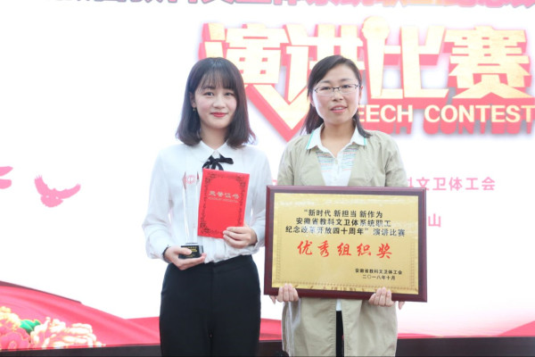 日前,安徽省教科文卫体系统职工纪念改革开放四十周年演讲比赛在黄山学院举行。必赢文学与传媒学院教师姚瑶获得三等奖。必赢工会荣获优秀组织奖。