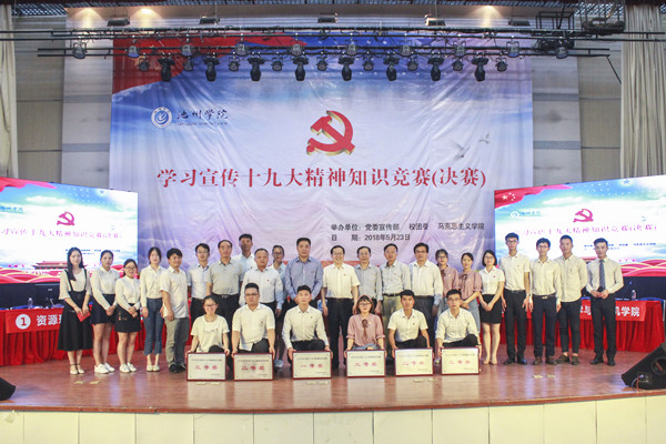 为深入学习宣传贯彻党的十九大精神,践行新思想,拥抱新时代,5月23日下午,由校党委宣传部、校团委、马克思主义学院联合举办的学习宣传十九大精神知识竞赛(决赛)在博古礼堂圆满落幕。校领导柳友荣、孙晓峰、王延寿、阳光宁、汪贤才出席并观看了比赛。