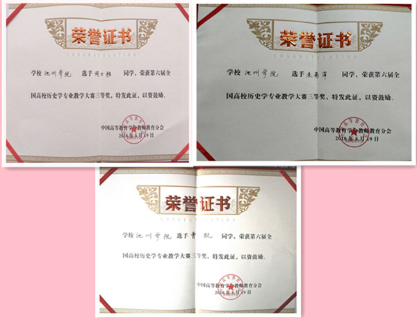 5月16日至19日,第六届全国高等学校历史教育专业本科生教学技能赛在云南师范大学举行。必赢旅游与历史文化学院16历史学专升本曹凯同学获得讲课组全国三等奖,15历史学周士雅、朱菊萍二位同学同学获得说课组全国三等奖。