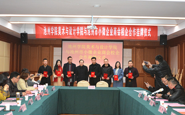 1月18日上午,美术与设计学院与池州市小微企业商会校企合作揭牌仪式在池州市天水湾大酒店四楼会议室举行。校党委副书记孙晓峰出席活动仪式,并为校企合作揭牌,教务处、学生处、美术与设计学院有关负责人,小微企业商会负责人和部分教师参加。