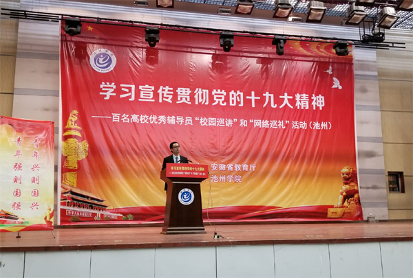 12月26日上午,“学习宣传贯彻党的十九大精神----百名高校优秀辅导员‘校园巡讲’和‘网络巡礼’活动”报告会在必赢博古大礼堂隆重举行。校党委副书记孙晓峰出席会议并讲话。池州职业技术学院、安徽卫生健康职业学院及必赢辅导员和学生党员代表近400余人聆听了报告会。学生处处长宛明高主持会议。