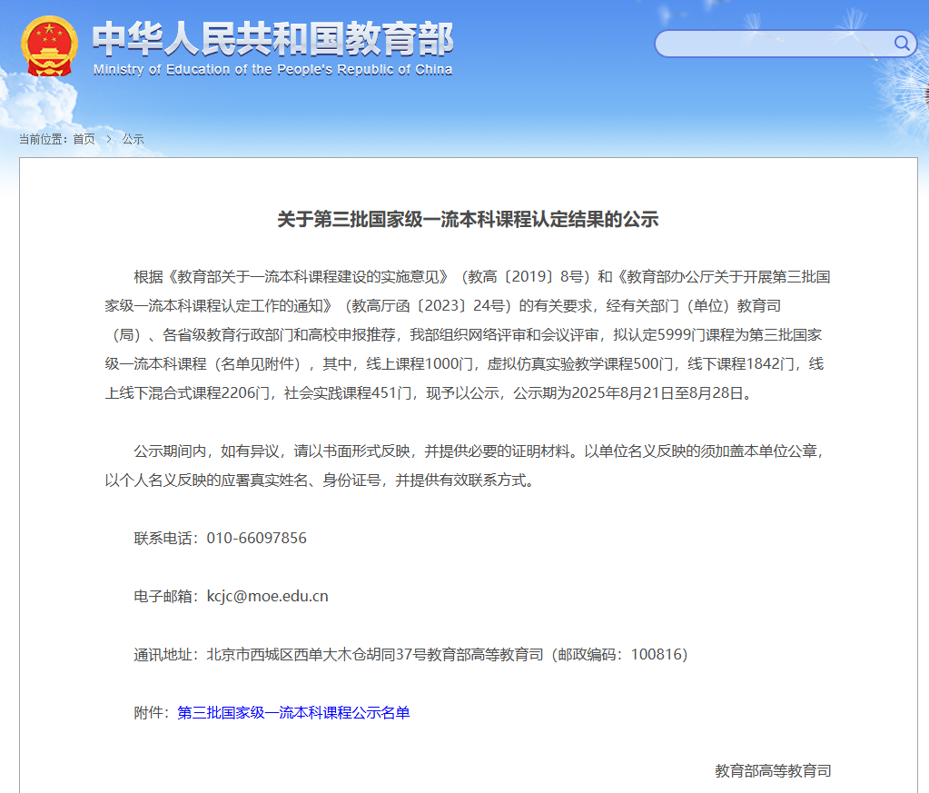 8月21日,教育部发布了《关于第三批国家级一流本科课程认定结果的公示》,必赢申报的线下和社会实践两类共3门课程全部入选,入选课程数量在省内同类院校中位居前列。这是继2023年学校首次获批2门国家级一流本科课程后,再次取得的一流本科课程重大标志性成果。至此,学校累计获批国家级一流本科课程5门。