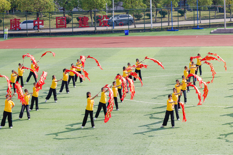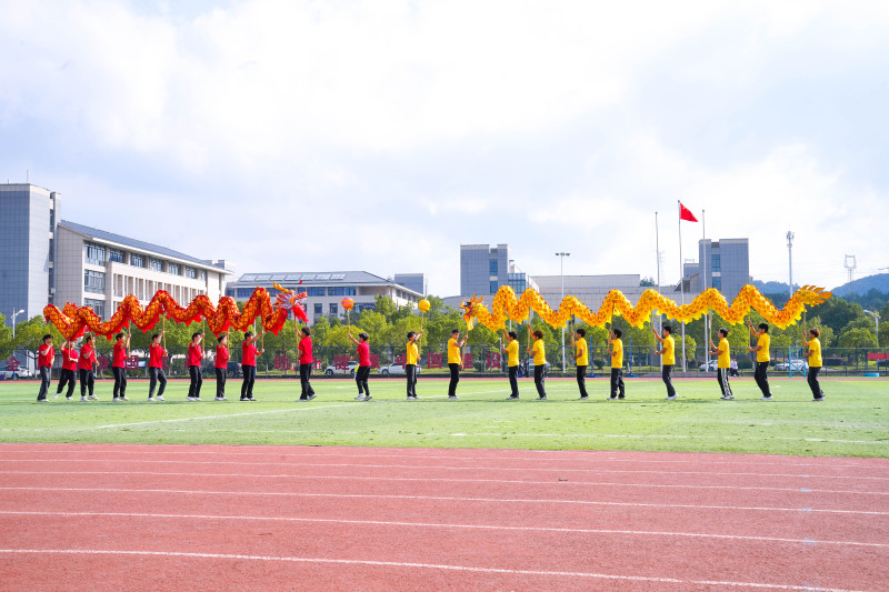 文体展演精彩纷呈、高潮迭起。鼓舞《铸就中华魂》气势恢宏,啦啦操《我的未来式》青春洋溢,国术表演刚柔并济,网球操活力四射,轮滑与流行舞动感十足,“彩带龙”飘逸灵动,健身操《奔跑的青春》热情奔放。压轴节目《盛世龙腾》舞龙表演更是将现场气氛推向高潮,双龙欢腾,展现出深厚的文化底蕴与奋进的校园气象。
