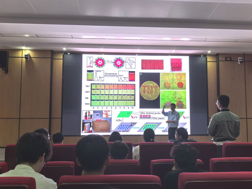 张奎教授围绕芳香硝基爆炸物、有机磷神经毒剂、放射性核素等危险物质的现场快速探测需求,介绍了新型光学传感材料的研发、基于比率荧光信号输出的可视化检测方法构建,以及可视化探测传感器的成功研制,实现了危险物质的现场快速可视化筛查,充分展现了以科技创新服务国家公共安全战略需求的实践成果。